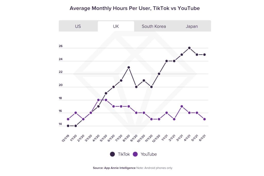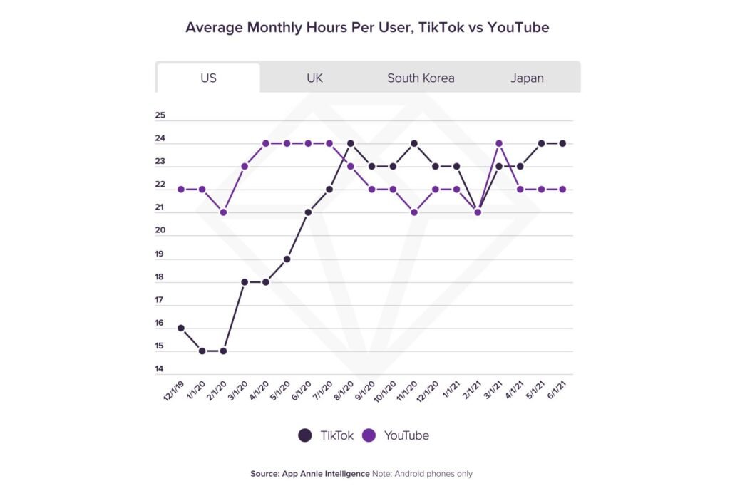 Los usuarios en EEUU han consumido de media hasta Junio de 2021 una media de 24 horas de contenido por mes, comparado con las 22 horas y 40 minutos en la plataforma de Google “Youtube”. En Inglaterra la diferencia es aún mayor. Mientras que TikTok los usuarios consumen de media 26 horas de contenido comparado a Youtube , que de media está en menos de 16 horas.